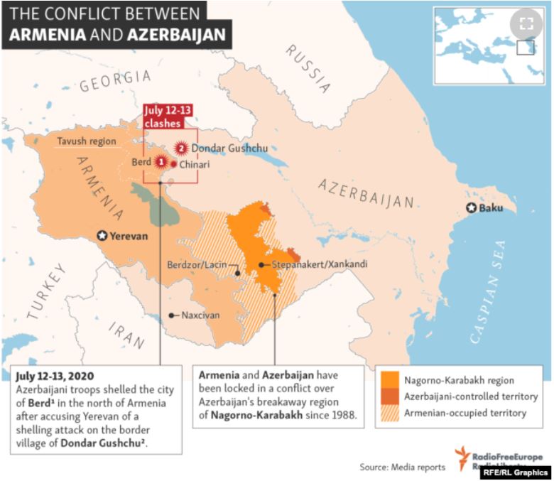 Escalated fighting on July 12, 2020 resulted in the death of an Azerbaijani general, among other soldiers on both sides. The fighting included the use of tanks, artillery, and military drones. Azerbaijan threatened to strike Armenia’s nuclear power plant (near the capital of Yerevan) with missiles.